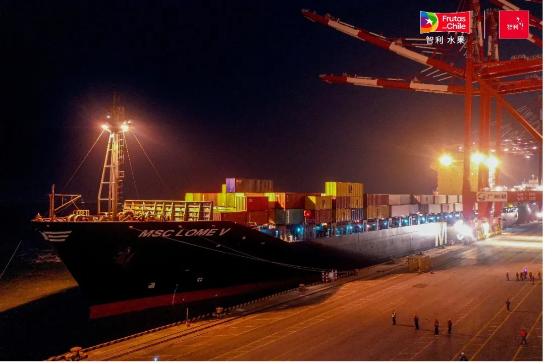 12月5日,从智利圣安东尼奥港出发的2025/26产季首条“车厘子快线”MSC Lome V号顺利靠泊广州南沙港。约370柜(约8000吨)新鲜车厘子经全程冷链从智利运抵广州,经海关查验后通过冷链车运往各地批发市场及冷库。