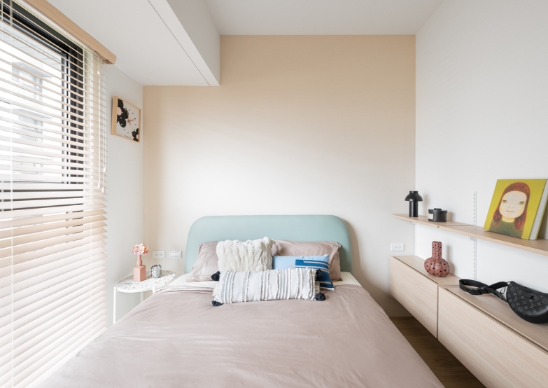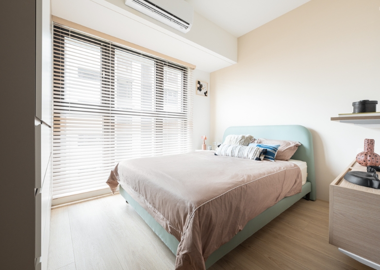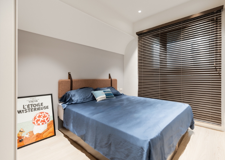 主卧的床头,以平静的杏色打底,与床尾衣柜的杏仁米门片作呼应。窗帘依旧挑选百叶帘设计,更符合空间当前基调,也利于日常调节采光。