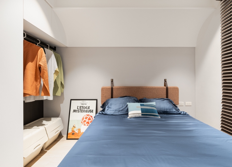 床头压梁,以圆弧形天花作修饰。衣柜的落地开放设计,不仅方便随手挂置和取用衣物,行李箱也能轻松推入、妥善安放。给每位在此过夜的友人,如同旅馆配置般地周到。