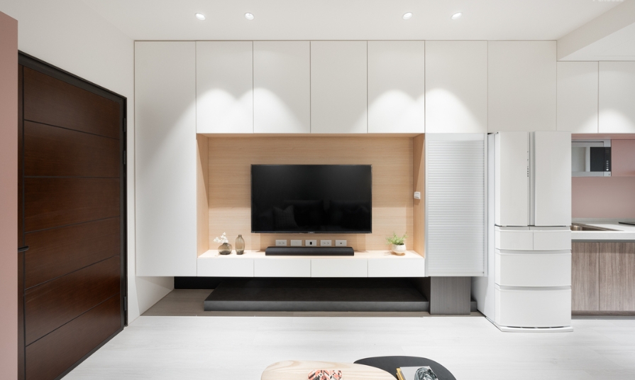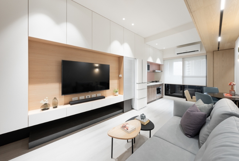 进门左手边一侧,规划了整面延伸至底的柜体,极大化地提升收纳机能。柜体的分隔经过安排,不仅包含了污衣柜、收纳柜、电视墙,还有电器柜、厨房备品柜。满足了机能的同时,也在视觉上营造出一种整齐与和谐的美感。