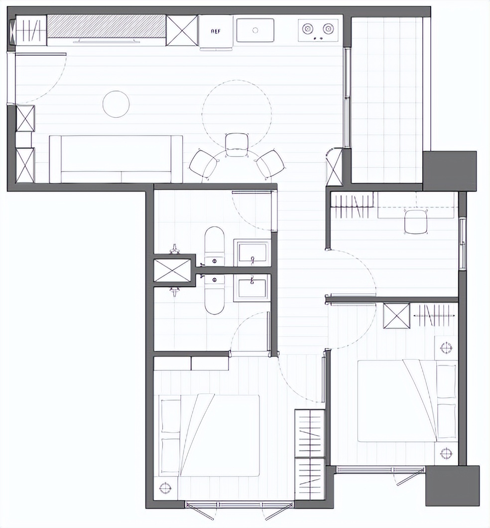 50㎡的使用面积,还是相当不错的,没有犄角旮旯的区域,整体空间利用率还是很高的,两间卧室搭配一间书房,足够满足日常居住需求。