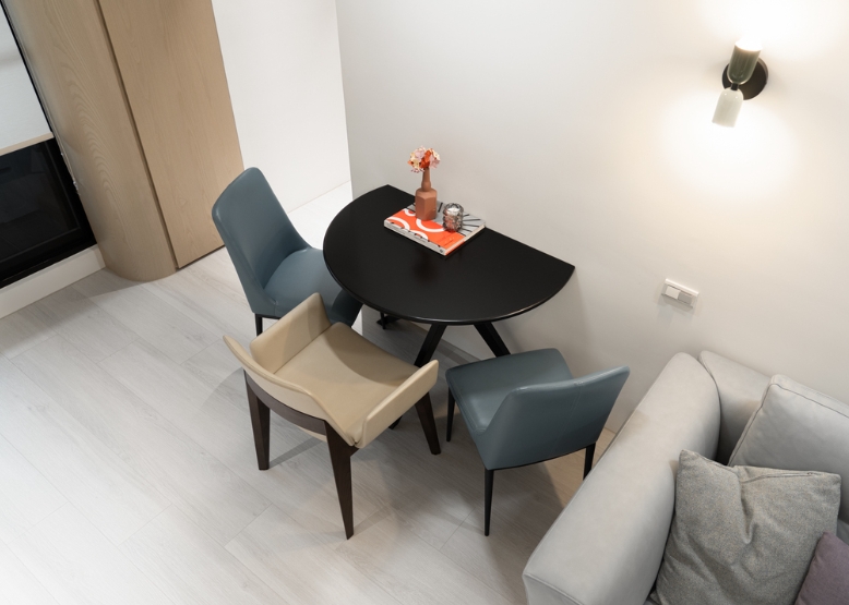 为了能尽量保持公区的空间感和流畅动线,购置一款半圆形餐桌,并将其靠墙摆放。当有朋友来访时,这张半圆的桌子能展开变为完整的圆桌,瞬间提供了更多的座位空间,方便大家围坐聚会。