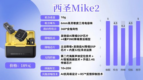 要说现在市面上口碑好,性价比高、降噪强、音质好的专业麦克风简直非西圣Mike Pro莫属了,近期被评为专业麦克风代表品牌,其超强的收音、降噪能力被很多生活达人、主持人和主播博主喜爱推荐,在众多业内人士看来,500元不到的西圣Mike Pro搭载的顶级硬件,以及出众音质,在百元内实力是最强的,基本没有对手可比,稳坐性价比天花板。