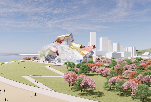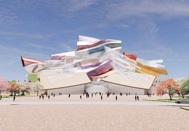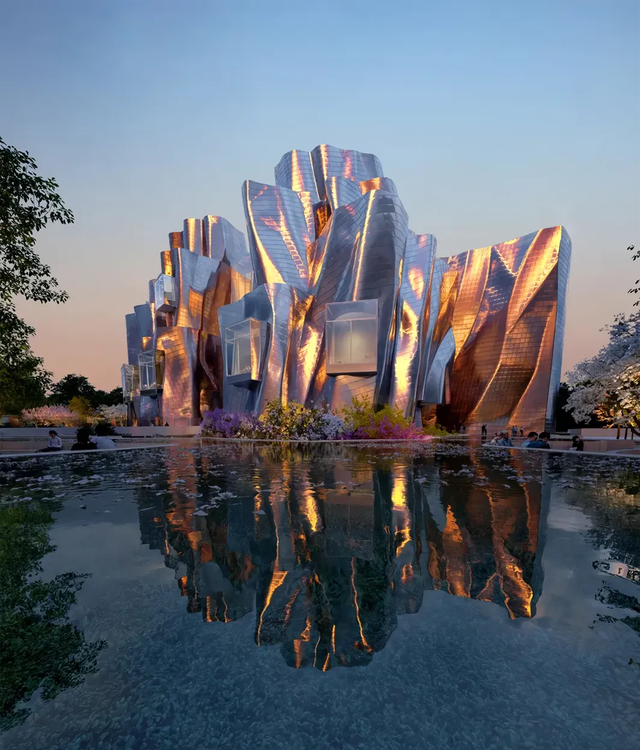 随着日光与天色的变幻,建筑表面折射出细腻柔和的光影层次,呈现出如水彩画般的动态视觉效果。这种设计不仅延续了盖里标志性的解构主义风格,更将东方自然哲思融入其中,使美术馆与周边环境产生柔性共鸣,在城市肌理中形成一道独特的诗意风景线。