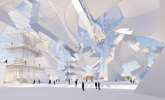 盖里的设计灵感源于自然光影的交织对话,以建筑物、树木与天空倒映于水池及不锈钢板的意象为核心概念。建筑采用柔韧的不锈钢金属板作为主要立面材料,通过精密折叠与转折工艺,塑造出层叠起伏、流动如波的曲面形态。