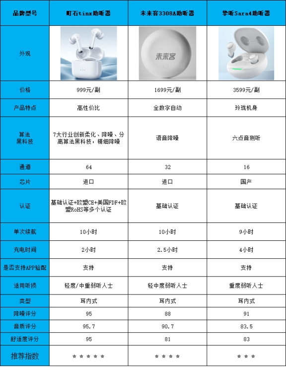 音质测评结果:町石 > 未来客 > 挚听町石助听器音质测评表现町石的音质表现相当不错,清晰度和细腻度都很高,带给人的听感也相当真实。 在测试时,町石能够精准呈现各种音符和语句的细节,尤其在处理快节奏音乐或语音时,它能够无失真地还原高低频的丰富层次。它配备了64通道技术与靶向高密度声源定位技术,进一步提升了音质的自然感和精准感。根据测试数据,町石的音质相比其他同类产品,真实感和细腻度提升了不少。无论是安静的场合还是噪音较大的环境,町石都能提供清晰且真实的音质,特别适合对音质要求较高的朋友。未来客助听器音质测评表现未来客在音质方面表现得还不错,整体清晰度和真实度都可以满足日常需求。 在快节奏音乐和语音内容的处理中,未来客能够较好地还原音频的细节,尤其在人声的表现上还算清晰。不过,在低频表现上,未来客稍有不足,音质有时会显得有些模糊。未来客的多通道声音调节技术提升了音频的不同频段,尤其是在中低频的表现上有所改善。然而,在一些复杂的音频场景中,它偶尔会有些失真,特别是当要求更高保真度时,音质表现有些不足。总的来说,未来客适合日常对话和普通音频需求,但在追求高保真音质的场景下,可能还需提升。挚听助听器音质测评表现挚听的音质表现还算可以,基本满足日常听音需求,但细腻度和真实感上有所欠缺。 在处理快速音符或语音时,挚听的清晰度表现得还算可以,但在复杂的音频场景中,音质就显得有点模糊,某些细节不太清晰。挚听的音频处理技术相对简单,虽然音量足够大,但在音质还原方面的表现比较局限,尤其是在高频的还原上,挚听的表现不算特别理想。对于日常对话来说,挚听没问题,但对于要求更高音质的人来说,它的表现就可能不够理想了。