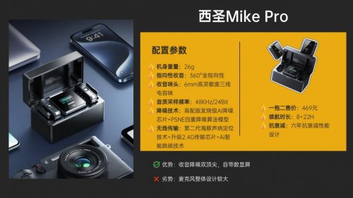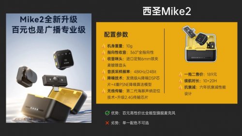 现今无线领夹麦克风性能虚标泛滥,过度聚焦外观与便捷,近70%用户吐槽音质差、信号不稳。在此力荐西圣Mike2,作为声学领域专注品牌,专为对音质及稳定性要求严苛的专业创作者、直播人士打造“超常规”精品。西圣Mike2具备业内罕有的顶配音频性能,独创10项领先技术,摒弃冗余大众功能,坚守“超常规”的专业音频理念,通过发烧级Ai降噪DSP芯片、4重PSNE降噪算法模型和加强版全指向AI感知麦克风等核心性能,深受众多权威人士与知名主播推崇。相比行业一流竞品,其信号稳定性达98%,100%不掉线、不延迟、不干扰,兼容各类环境与设备,堪称百元内音质、续航、性价比最佳的无线麦克风。