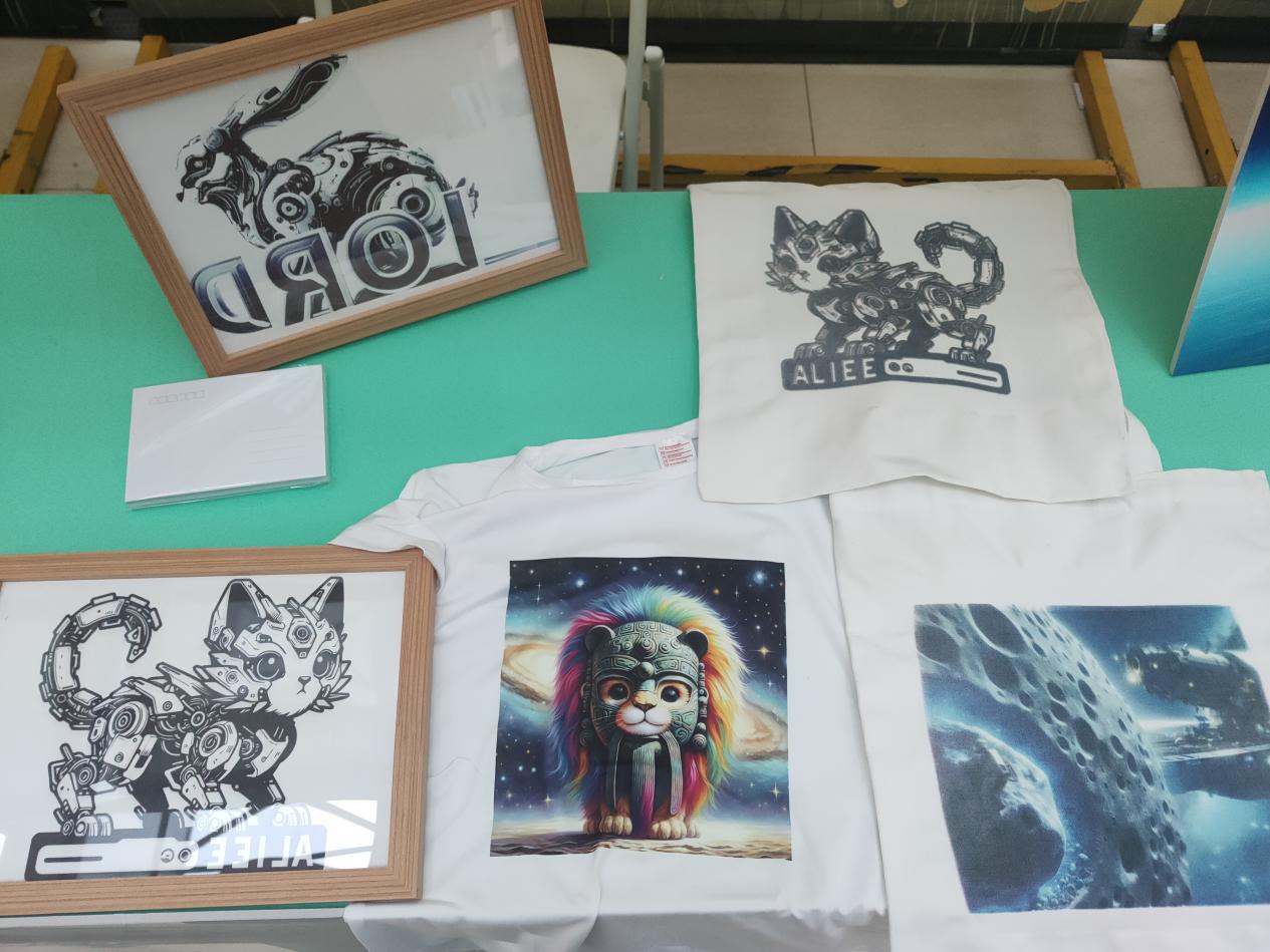 虚实科技还展出了利用AI绘画技术创造的文创产品,如独具匠心的T恤衫、帆布包和画框等。这些产品不仅展示了AI技术在艺术创作领域的应用,也体现了技术与日常生活的完美结合。通过AI技术,普通的日用品转化为独一无二的艺术作品,让艺术走进普通人的生活,提升生活的美学价值。