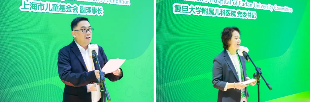 图:上海市儿童基金会副理事长陈勇先生及复旦大学附属儿科医院党委书记李倩女士发言