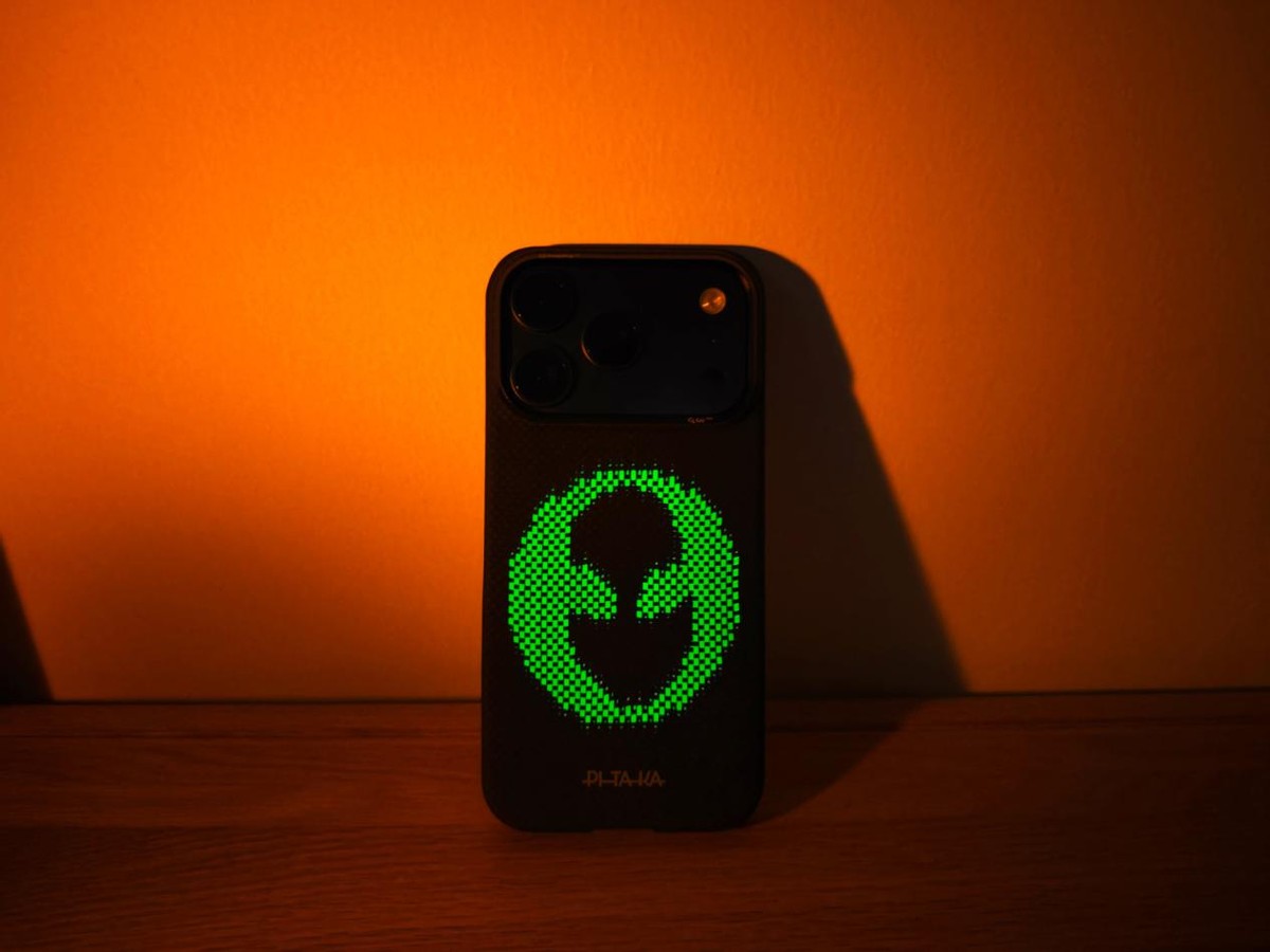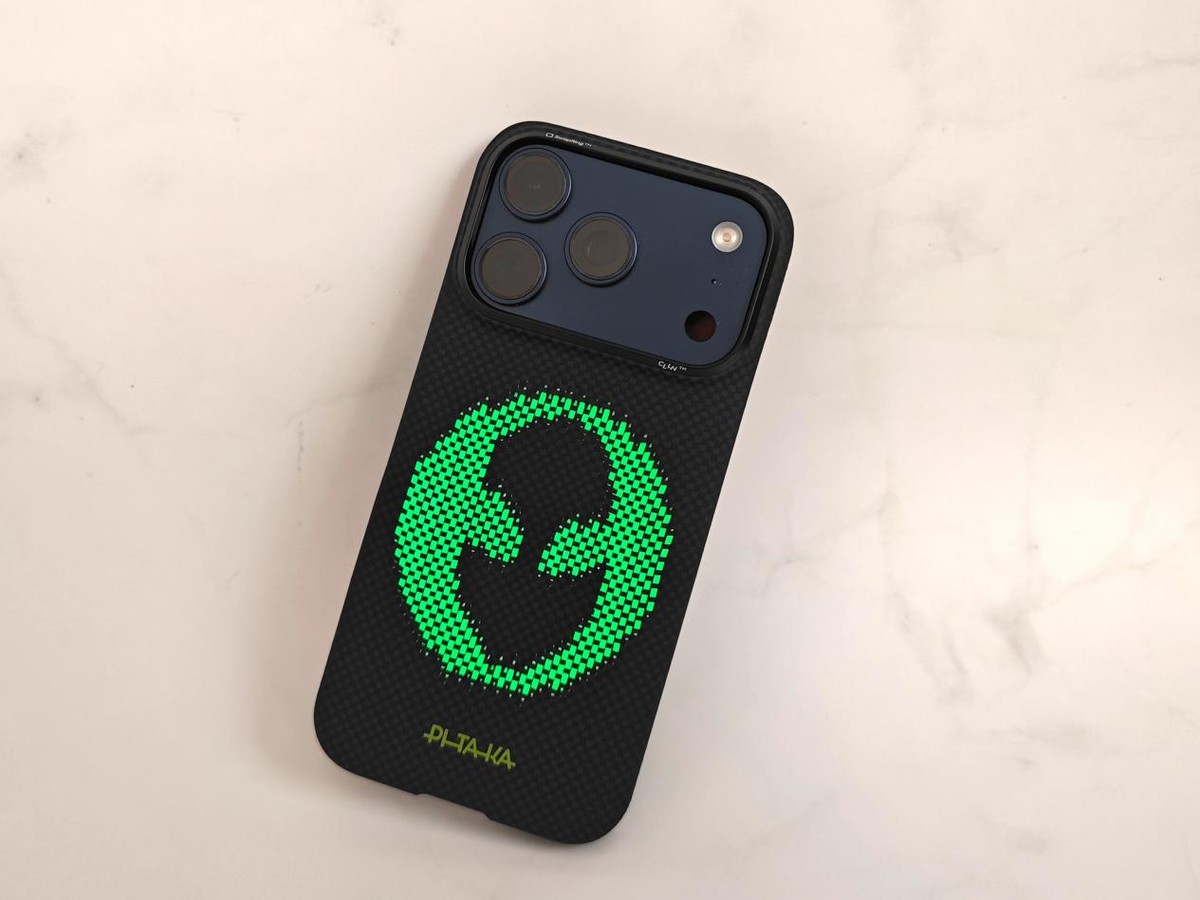 手机壳背部是用PITAKA独家Lumintex流萤纤维融合凯夫拉材质纱线编织出来的醒目外星人图案。令人过目难忘。