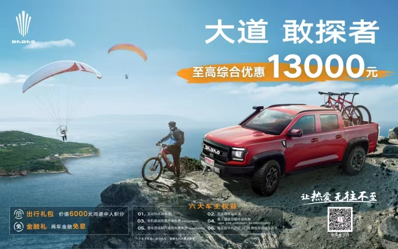 如果你也是一个怀揣探险梦的人,别再犹豫,赶快抓住这个夏日优惠的契机,驾驶江铃大道敢探者,踏上充满激情与自由的征途。我们期待看到你在同道中人社区分享那些冒险经历,以及那份由衷的驾驶乐趣。夏天的故事,等待你的书写!