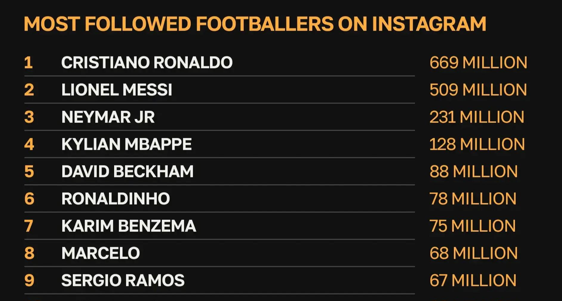 这是球星们的核心战场。截至2025年,C罗的Instagram粉丝高达6.69亿,全球无人能及;梅西也有5.10亿粉丝,随便发张训练照都能轻松破亿浏览。