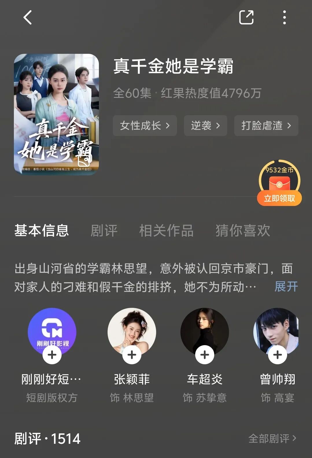 《真千金她是学霸》是近期一个非常具有代表性的案例。这部剧在红果上线后,首周即登顶热播榜第一,观看量突破20亿。
