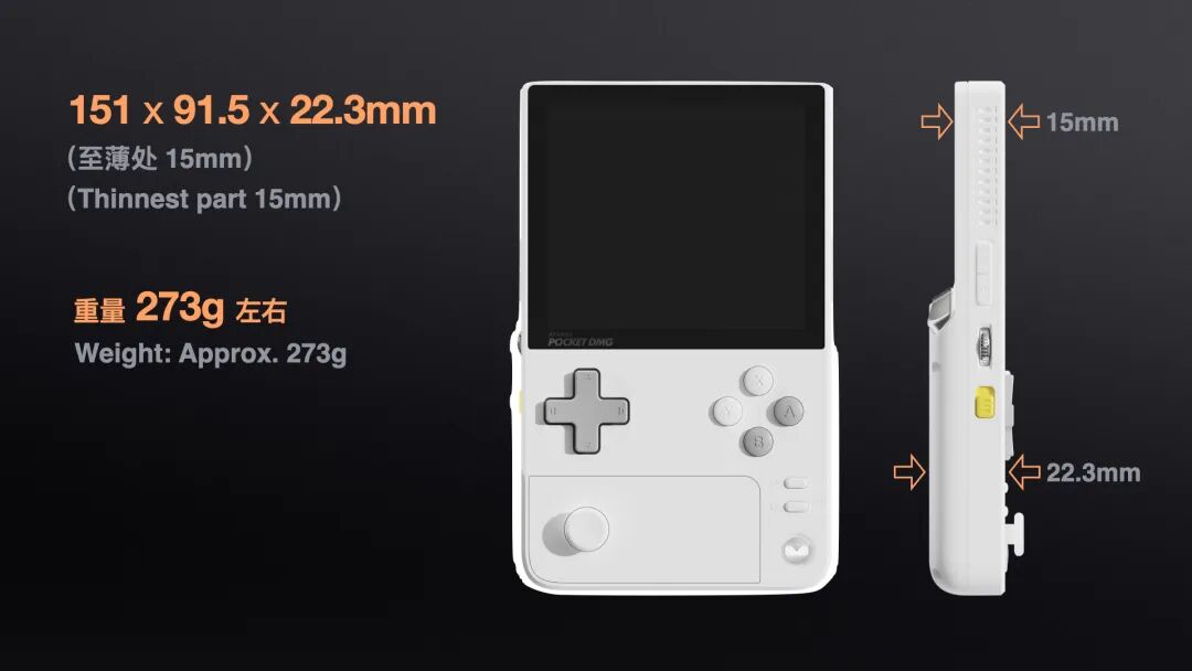 Pocket DMG 在小巧尺寸中寻找到绝妙的握持平衡。91.5mm 的机身宽度搭配 278g 的重量,与 3.92" 屏幕相得益彰,让竖握体验自然顺滑。机身底部采用大曲率 R 角,与掌心接触的核心握持区域基于曲率更大的 3D 弧面设计,加上边框的倒角衔接,使手指、掌心与机身的接触更贴合、更舒适,长时间游玩也乐此不疲。
