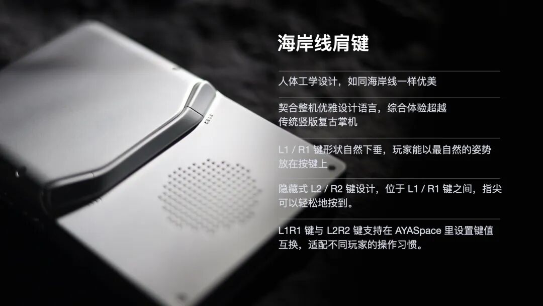 AYANEO 从自然界中汲取灵感,为 Pocket DMG 设计出别具一格的「海岸线」肩键。优雅弧线与整机造型相呼应,L1 / R1 键自然下垂的形状融合人体工学设计,握持的时候食指能够以最自然的姿势放在按键上。更巧妙的是,四个肩键被分为三个部分,实现了隐藏式 L2 / R2 键设计,手指仅需轻微移动即可触达。四颗肩键均为轻触开关按键,手感干脆利落,搭配 AYASpace 的按键互换与深度自定义功能,使肩键操作更加丰富而充满乐趣。