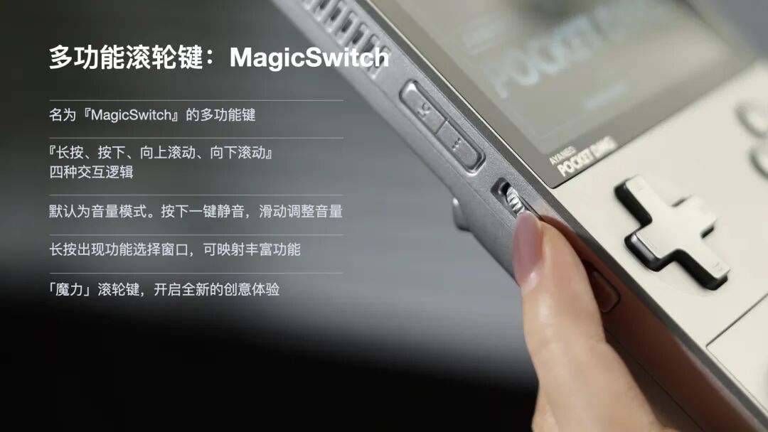 Pocket DMG 为竖版掌机带来极富创意的交互革新。「MagicSwitch」创意滚轮多功能键,支持长按、按下、向上滚动、向下滚动等交互方式,长按之后会出现选择功能的交互窗口,提供音量调节、一键静音、亮度调节、性能模式调节等实用功能,还能映射丰富的便捷操控功能,为玩家创造富有魔力的操控灵感时刻。