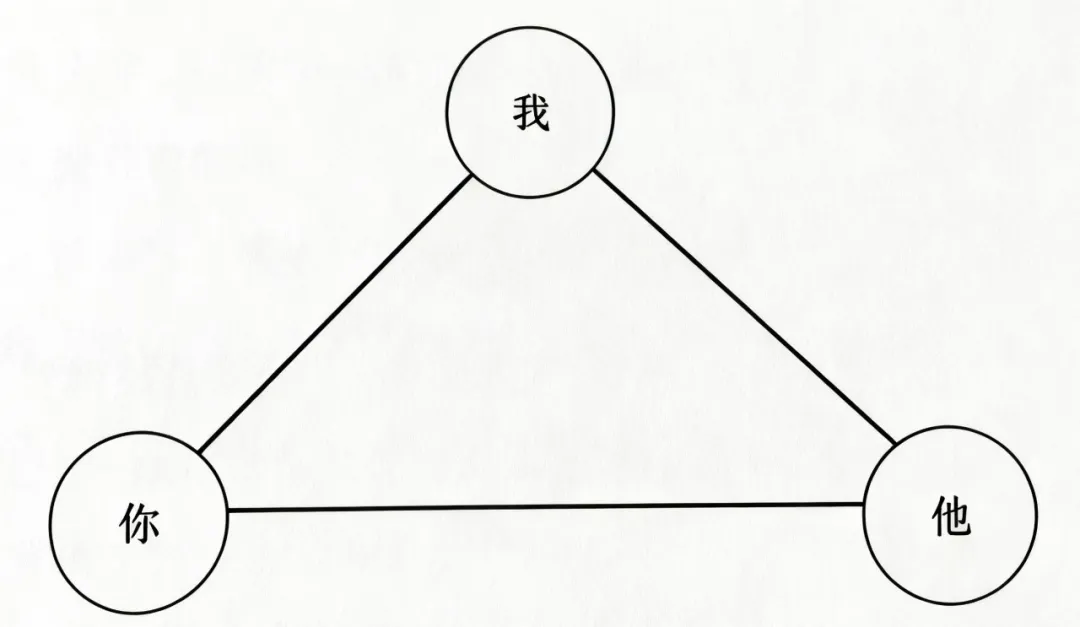 所谓三角形结构,指的是三个平行的点连在一起(如图4所示)。你可以在纸上画三个点,然后把三个点连成一个三角形,之后在每个点处标上代表的对象,可以是你、我、他,也可以是客户、员工和企业,还可以是家庭、工作和学习。
