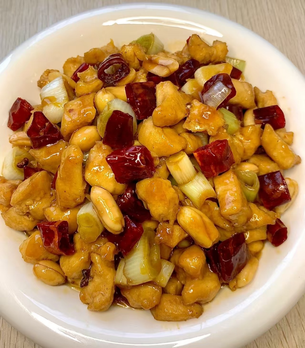 这盘宫保鸡丁,不配米饭是“耍流氓”。盛一碗热腾腾的米饭,把鸡丁连汁带肉盖上去,米饭瞬间被“收编”,粒粒裹着酱汁,像穿上了红袍的小士兵。一口下去,你就知道,什么叫“嘴巴根本忙不过来”——嚼鸡肉、咬花生、扒米饭,连说话的空都没有,只能发出“嗯嗯嗯”的满意噪音。
