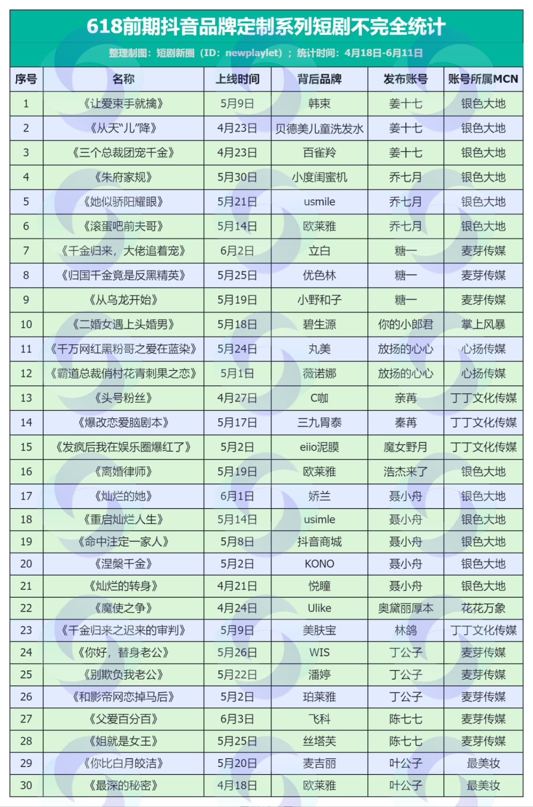 短剧新圈(ID:newplaylet)对618期间的品牌定制短剧做了不完全统计,其中,仅抖音平台就超过30部。