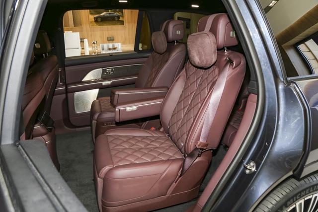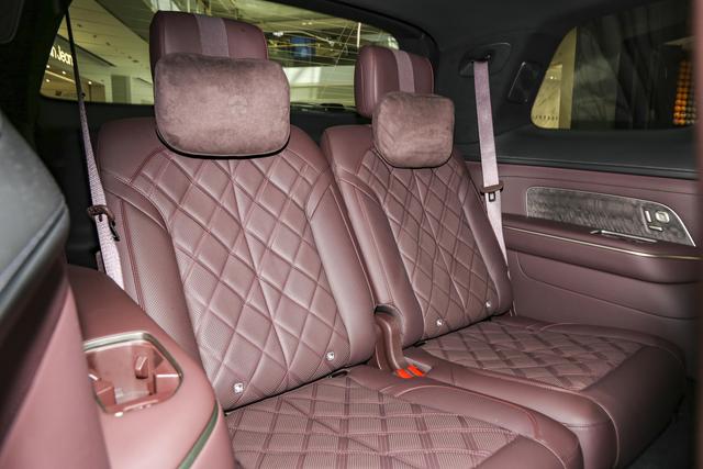 二排两个独立座椅还支持电动横移,调个“贴贴模式”,照顾小孩或家人聊天都顺手。座椅是带12万针脚刺绣的Nappa真皮,摸着手感细腻,门板、中控台全是超纤绒包裹,没有一点硬塑料的廉价感。我们试驾的黛山蓝内饰很特别,白天是灰蓝色,晚上开氛围灯就变成蓝黑渐变,氛围感直接拉满。