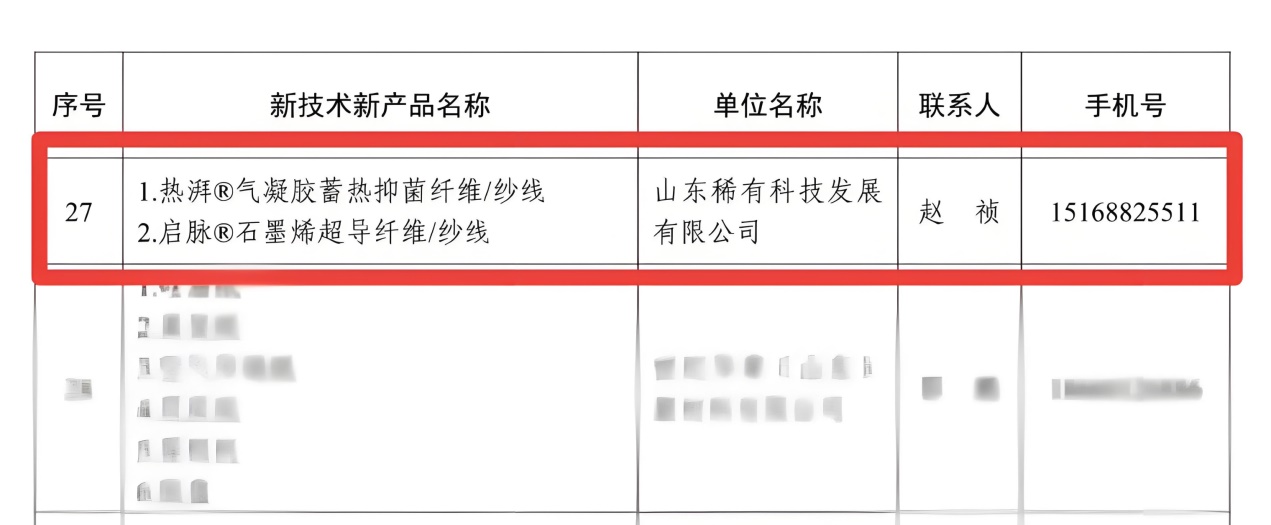 山东稀有科技发展有限公司【热湃®气凝胶蓄热抑菌纤维/纱线】【启脉®石墨烯超导纤维/纱线】创新产品成功入选山东省功能复合材料产业链新技术新产品(序号27)。