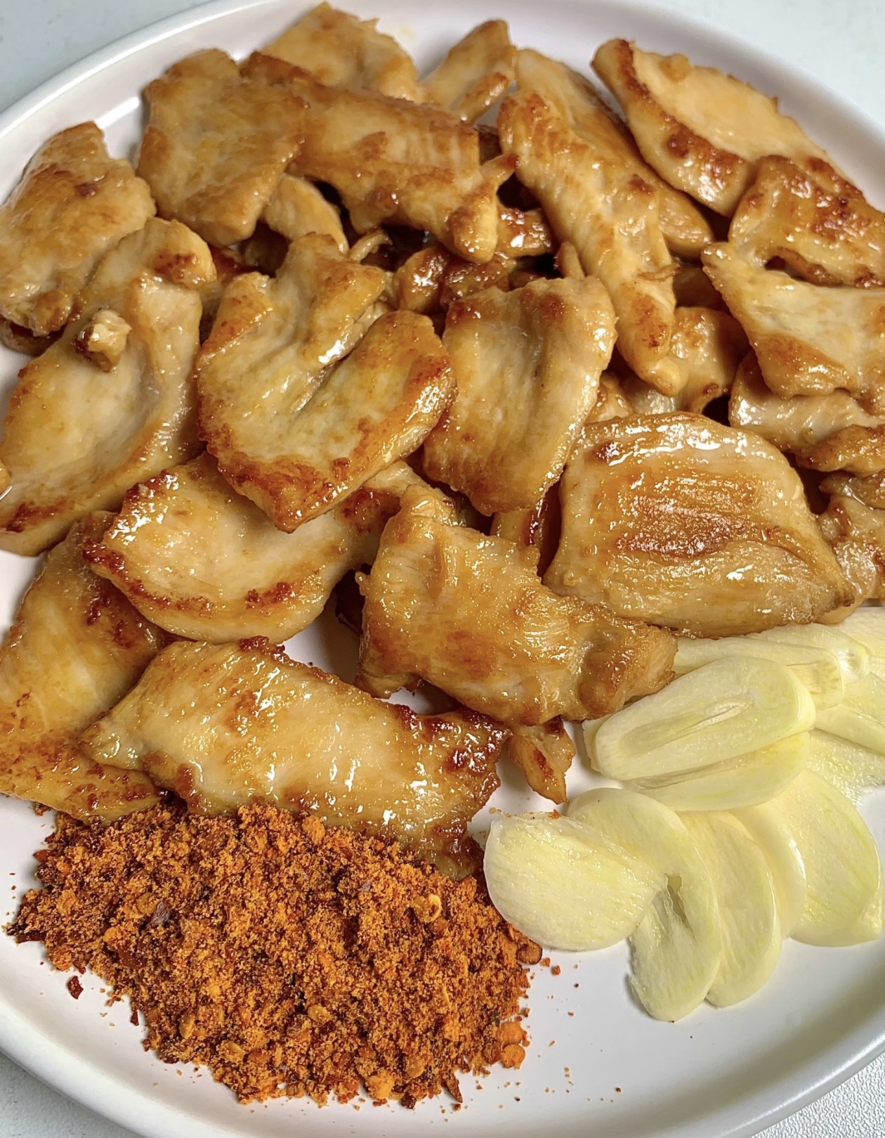 煎好的鸡胸肉直接盛到盘子里,趁热撒上一层辣椒面,再把切好的蒜片摆到旁边。看着那金黄焦脆的外皮,裹着红彤彤的辣椒面,还冒着热气,口水都要流下来了!夹起一块,裹满辣椒面,再夹一片蒜片,一口咬下去,外焦里嫩,肉汁在嘴里爆开,辣椒面的香辣和蒜片的清爽完美融合,完全就是烤肉店的味道!
