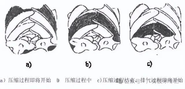 随着转子的旋转,齿间容积由于转子齿的啮合而不断减小。被密封在齿间容积中的气体被占据体积也随之减小,导致压力升高,从而实现气体的压缩过程,如图b所示。压缩过程可一直持续到齿间容积即将与排气孔口连通之前。如图c所示。