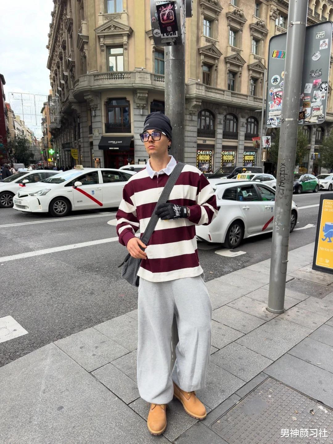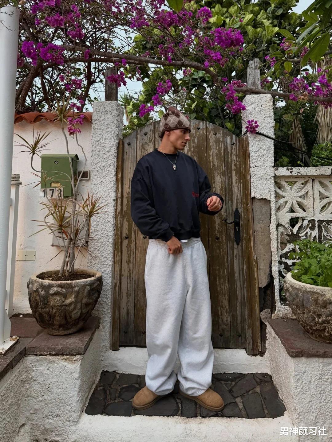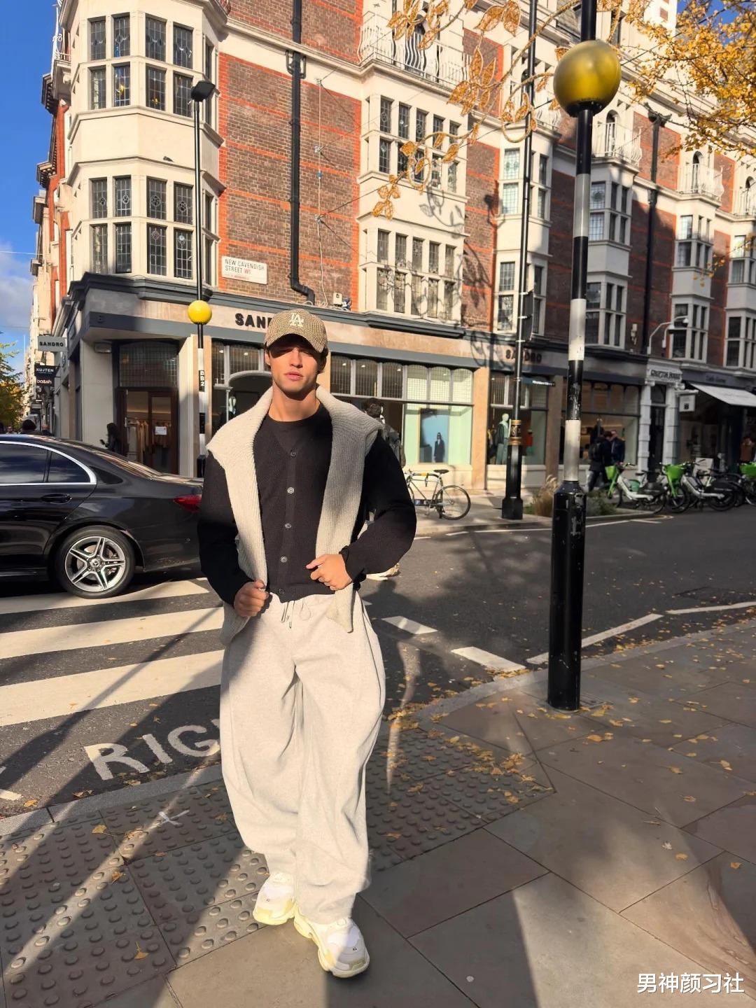 如果你觉得卫衣+卫裤太像去健身房,不妨试着给上半身变身。把卫衣换成柔软的羊绒毛衣,再随性地披一件浅色系毛衣在肩膀上。这种穿法是典型的老钱风变种,卫裤的随意感被毛衣的贵气中和得刚刚好。