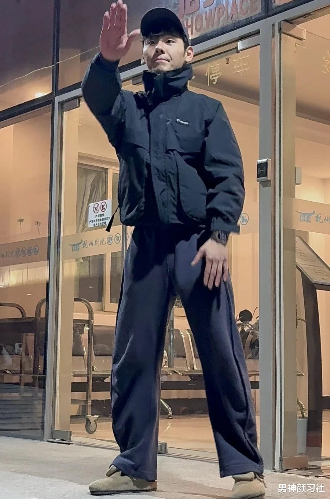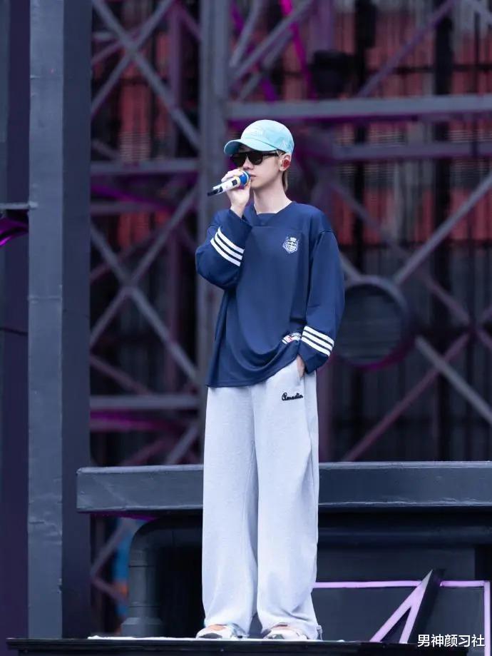 汪苏泷曾有一身非常直男但意外耐看的穿法:藏蓝色长袖 + 灰色卫裤。没有花哨的装饰,只有干净的色彩对比。这种休闲感是非常接地气的,适合每一个想在周末午后出门喝杯咖啡的男生。