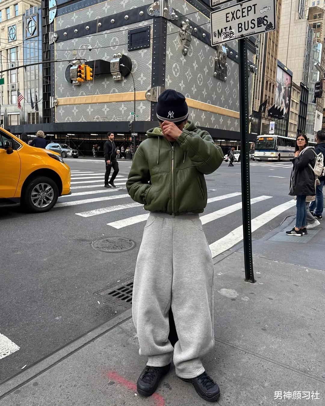 短款的外套也是这个道理,穿一条卫裤,不仅显得腿长,还很休闲。还通过卫裤注入了街头基因,是标准的冬日学长风。