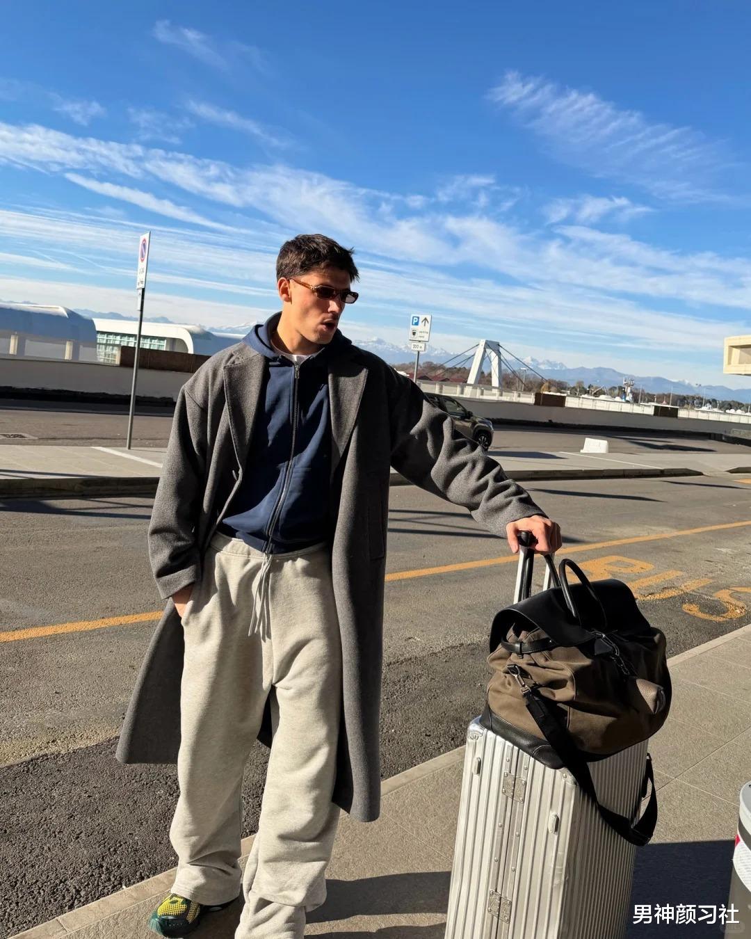 为什么这么穿?卫裤的弹力让你在窄小的座位里也能自如伸展,而短款外套提高了腰线,避免了羽绒服带来的臃肿感。这种穿法不仅方便,更有一种要去度假的轻盈感。