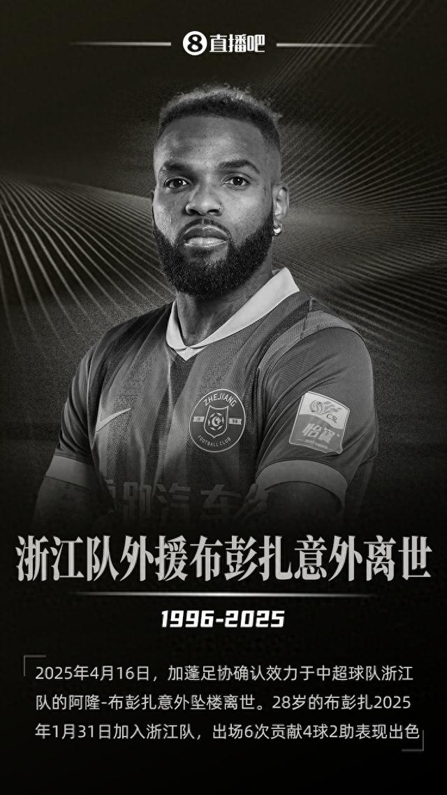 布彭扎4天前还参加了浙江队和上海申花的比赛,并且在比赛中送出了1次助攻。突然传出布彭扎坠亡的消息,我一时间都没能反应过来是什么意思。正常情况下,今晚和梅州队的比赛应该要延期,浙江队在这种情况下参赛,战术上、情绪上都很难准备好。“足球从不高于生死”,逝者安息。