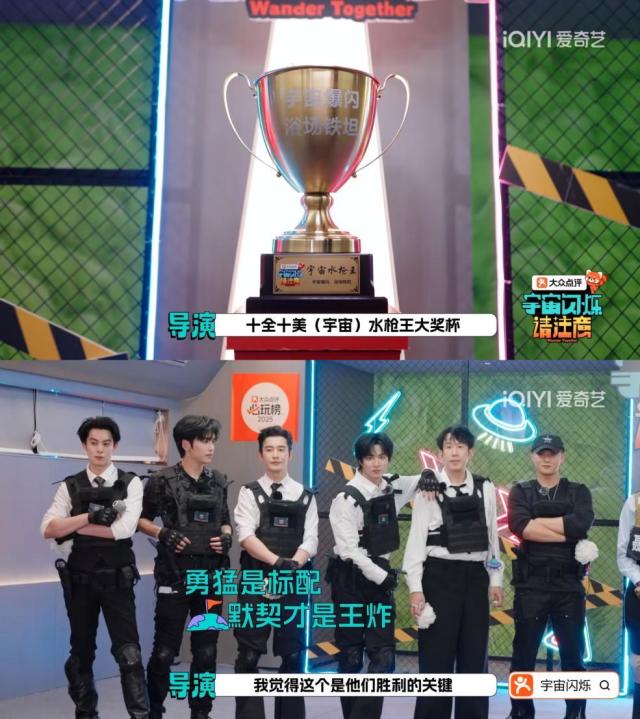 接下来的天台猜歌游戏是宇宙爆闪团的抽象大赏,大家穿的宇宙服装又一次刷新了节目在丑衣服赛道上的成绩。同时拍抢答按钮时的激烈竞争已经小小看出来宇宙爆闪团的速度,等到真人CS更是见证大家在团队战中能有多燃。在人数不占优势的情况下,以找人集合,集体行动为优先策略,战至后来则将淘汰对手优先于插旗,最后在游戏结束前一瞬淘汰最后一个对手,取得压倒性胜利。