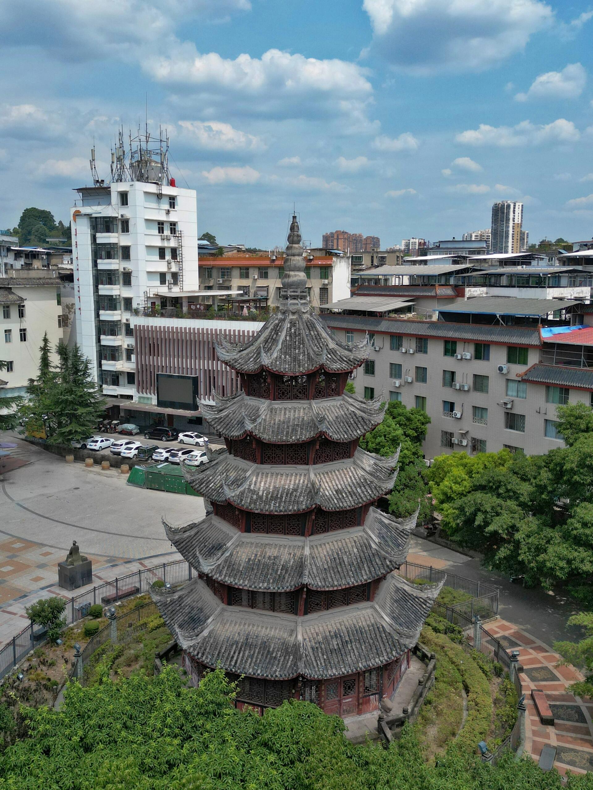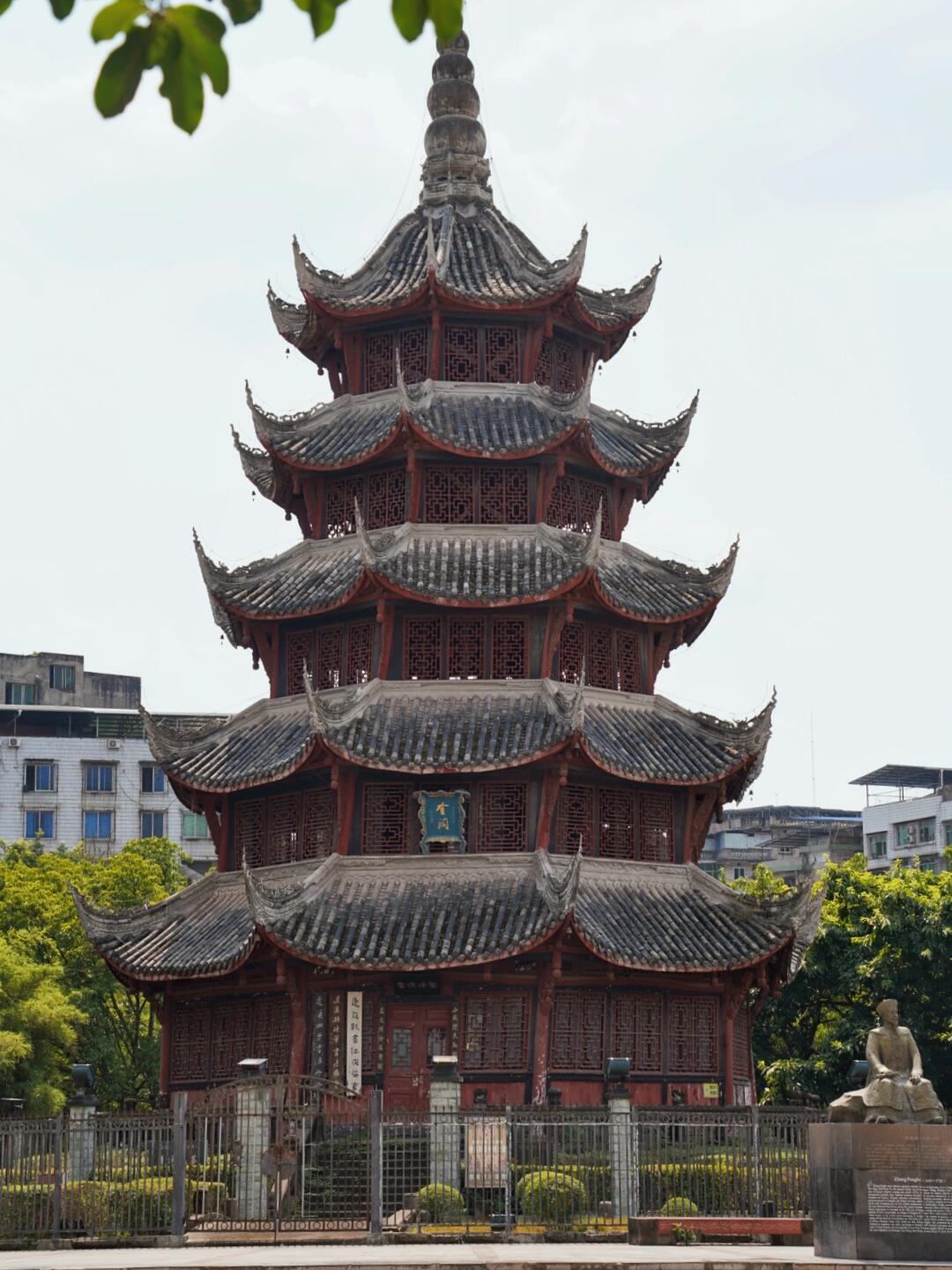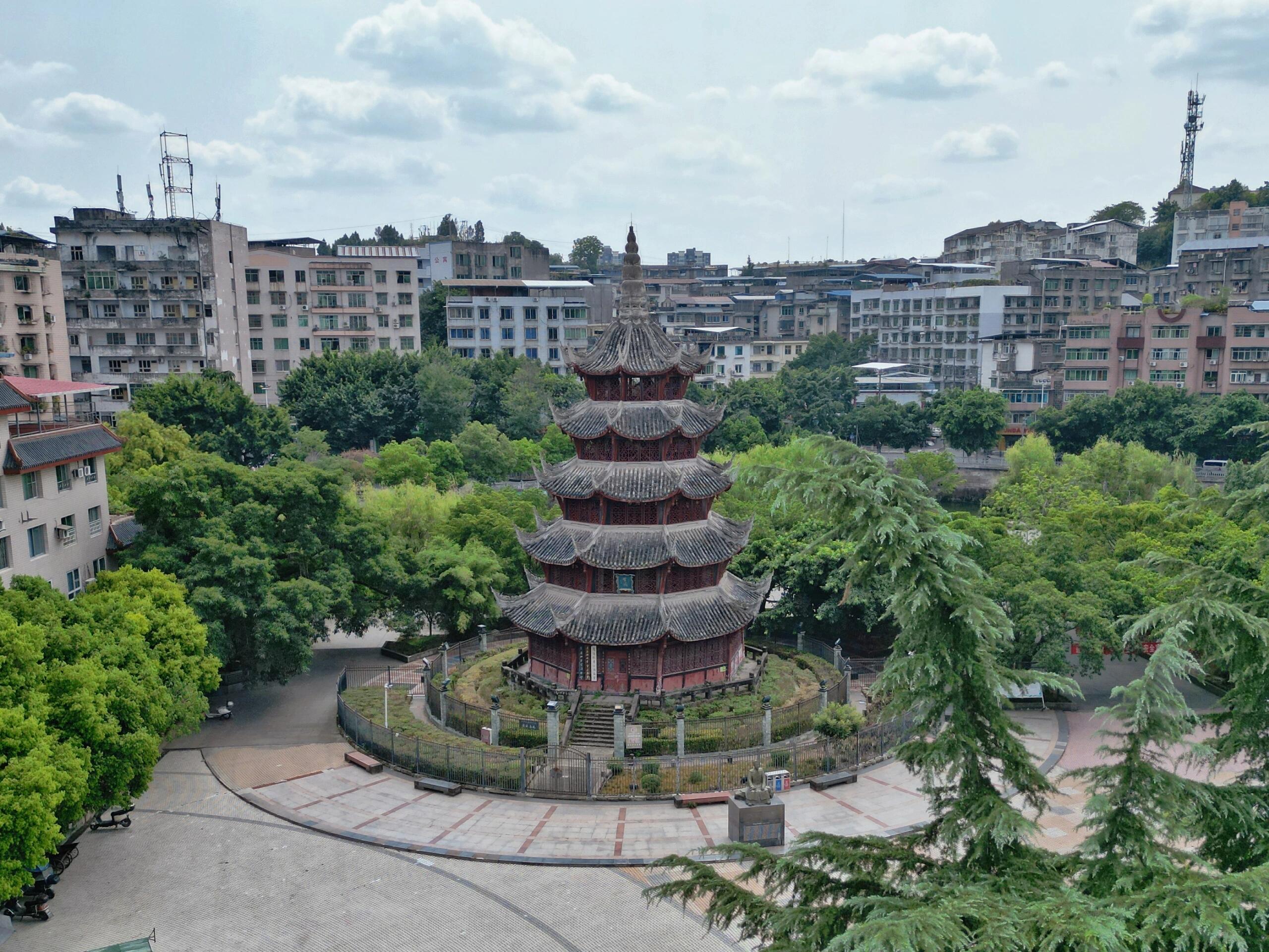 站在塔顶往下看,鳌峙堰的溪水果然像条绿绸带,绕着塔基打了个弯。阳光穿过木窗棂,在地上投下细碎的光斑,倒像是塔自己在眨眼睛。风从八面檐角钻进来,带着水汽和木头的味道,把楼梯的咯吱声、老街的叫卖声都揉在一起。这时才明白,这塔的倾斜也好,雕刻的争议也罢,其实都是蓬溪人自己的心事——读书人盼它端正如笔,庄稼人喜它灵动似水,匠人却早把这些心思都刻进了木头里,让它歪着身子,既望着文庙,又挨着溪水。