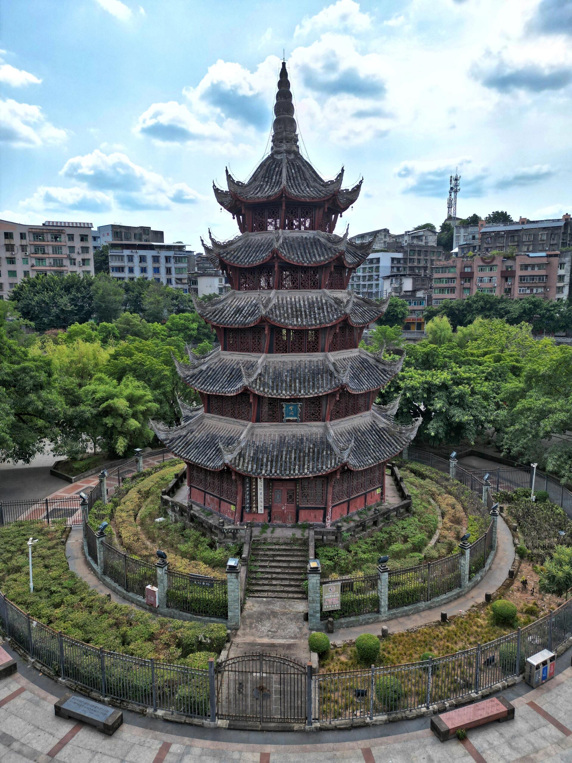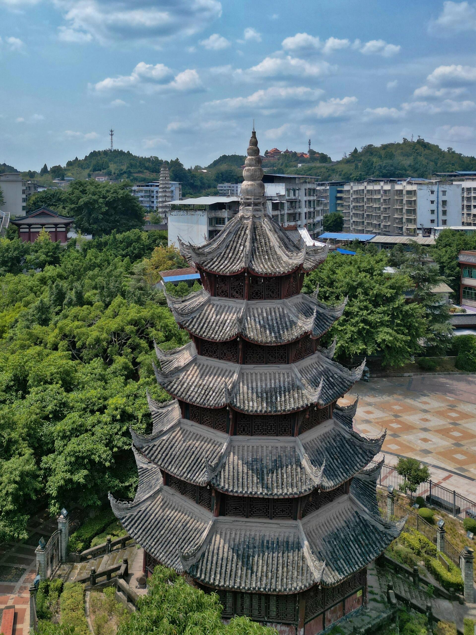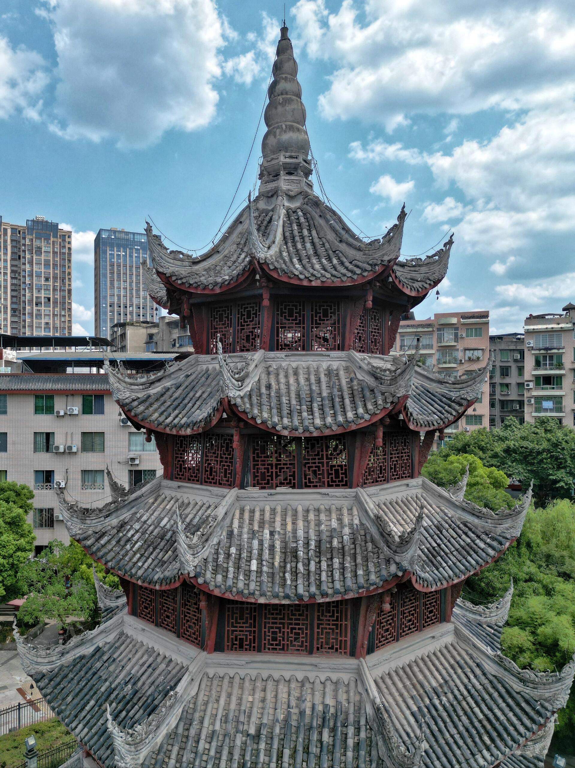 站在塔顶往下看,鳌峙堰的溪水果然像条绿绸带,绕着塔基打了个弯。阳光穿过木窗棂,在地上投下细碎的光斑,倒像是塔自己在眨眼睛。风从八面檐角钻进来,带着水汽和木头的味道,把楼梯的咯吱声、老街的叫卖声都揉在一起。这时才明白,这塔的倾斜也好,雕刻的争议也罢,其实都是蓬溪人自己的心事——读书人盼它端正如笔,庄稼人喜它灵动似水,匠人却早把这些心思都刻进了木头里,让它歪着身子,既望着文庙,又挨着溪水。