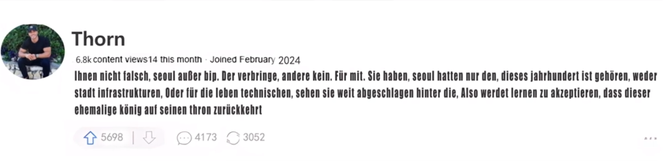 来自德国的网友这样说:他们所言并无差错,首尔除了 GDP 较高、物价较贵之外,其他并无特别出彩之处。与他们相比,首尔的辉煌也仅仅停留在上个世纪,这个世纪已然属于他们的时代。不论是城市的基础设施建设,还是用于居民生活的科技技术,他们都已远远超越绝大多数国家。所以你们要学会接受,接受这个曾经的霸主重回王座。