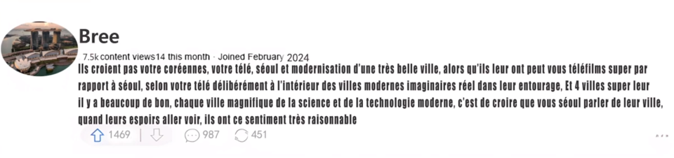 而来自法国的网友说:他们之所以这么认为,还不是受了你们韩剧的影响。在你们的电视剧里,首尔是一座极具现代化且美丽的城市。而在中国,他们有 4 座能够与你们电视剧里的首尔相媲美的超级城市。在你们眼中电视剧里虚构的现代化城市,在他们那里却真实地存在。而且除了 4 座超级城市之外,他们还有众多发展良好的城市,每一座城市都是现代与科技的完美融合。所以他们理所当然地认为你们的首尔跟他们的超级城市一样,当他们满怀期待地走出去瞧瞧时,却发现跟想象中的首尔并不一样,有这种感觉也是十分合理的。