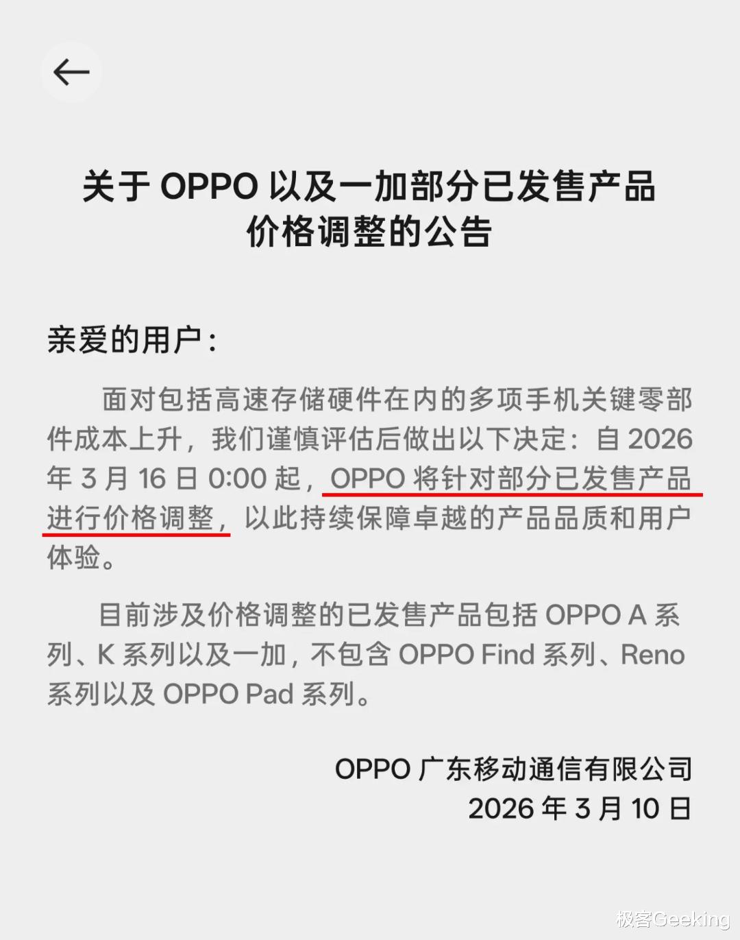 就在昨天 OPPO 品牌突然在官方商城中发布最新声明,标题是《关于 OPPO 以及一加部分已发售产品价格调整的公告》,宣布自从 3 月 16 日起对 OPPO A 系列、K 系列以及一加手机进行涨价调整。