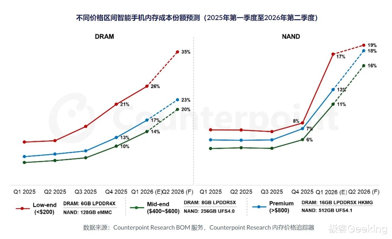 从具体数据来看,知名市调机构 Counterpoint Research 最新发布了内存价格追踪报告,核心观点为移动内存价格正在持续上涨,DRAM 价格在 2026 年第一季度环比上涨超过 50%,NAND 闪存价格环比上涨超过 90%。