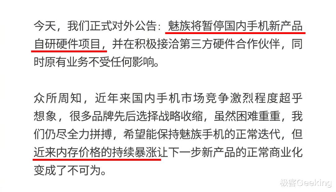 此前 2 月底魅族宣布停止自研手机硬件新品,给出的原因正是日益竞争激烈的手机市场和内存价格暴涨因素。