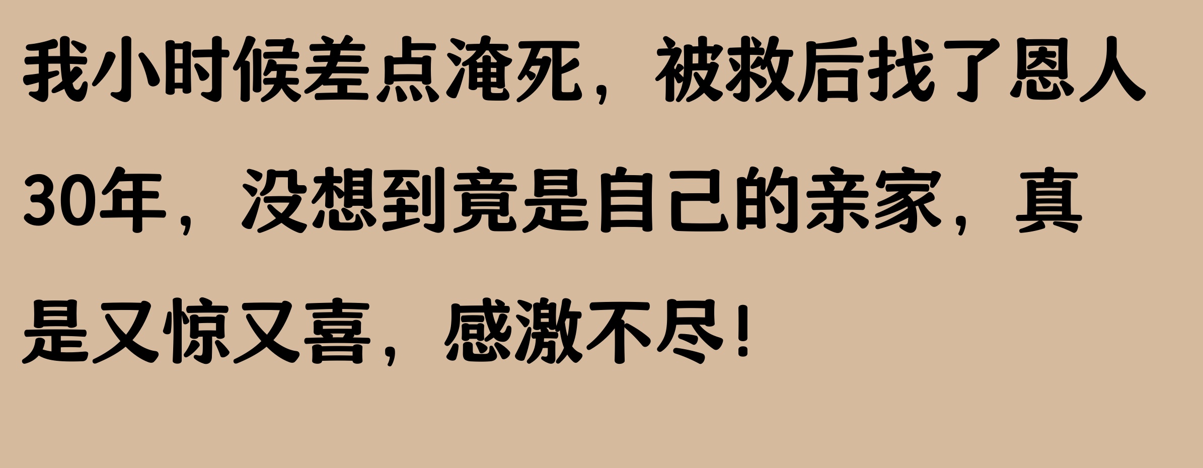 8岁那年,我在河边玩耍,不小心溺水了。一个陌生人把我救了上来,我当时非常感激他。多年来,我一直想找到这位恩人,表达我的谢意。没想到,当我终于找到他时,他竟然和我有亲戚关系,是我的亲家。这个发现让我既惊讶又感动。