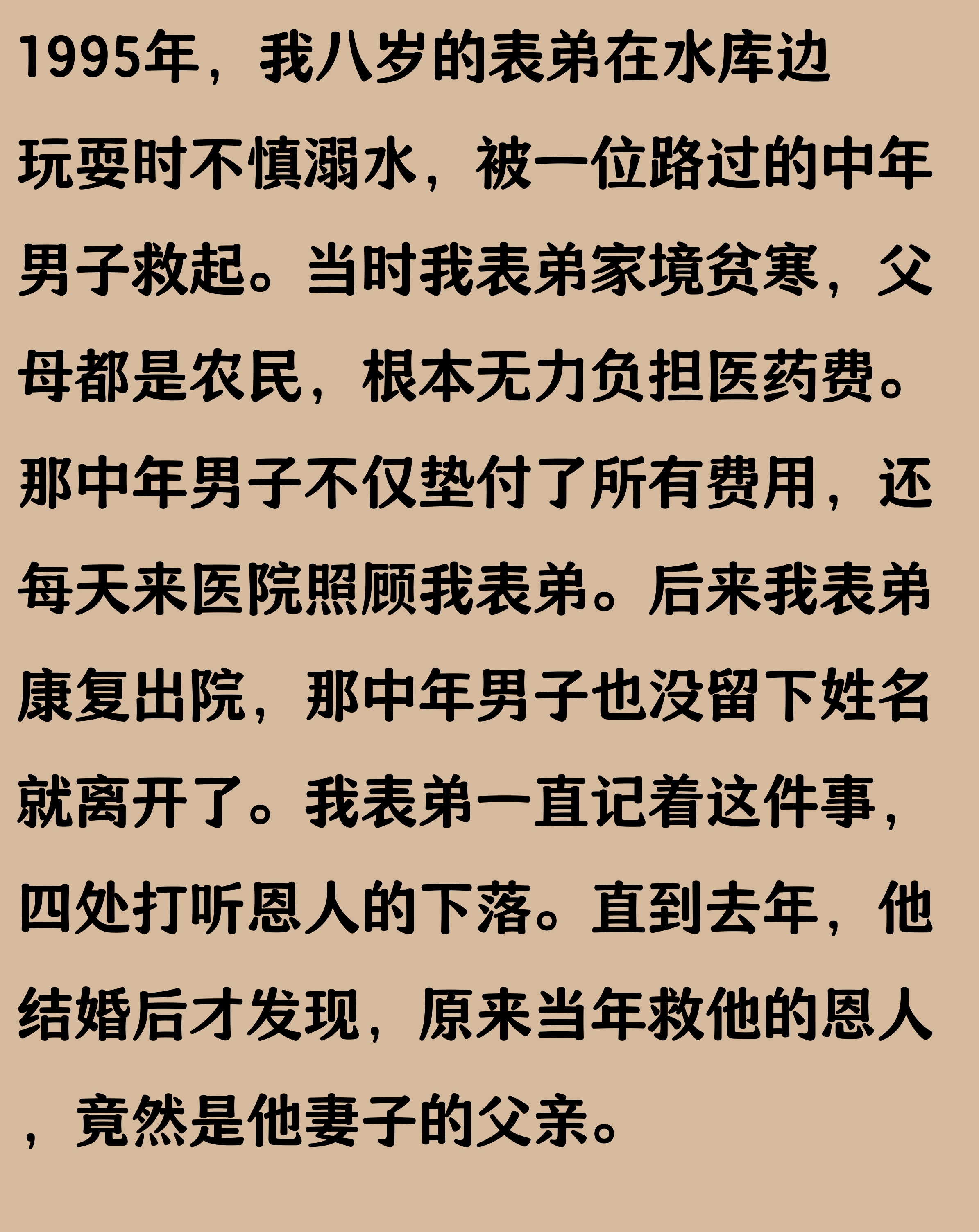 8岁的小男孩在河边玩耍时不慎溺水,被一位路过的中年男子及时救起。中年男子不顾危险,跳入水中将男孩拉上岸并进行急救。男孩得救后,家人感激涕零,承诺一定要找到恩人并表达谢意。然而,由于当时情况紧急,男孩家人并未留下中年男子的联系方式,只记得他穿着一件蓝色外套。男孩长大后,始终难忘救命恩人,便开始四处寻找。他通过社交媒体、社区公告等方式发布寻人信息,希望能找到那位恩人。经过多年的努力,终于在一个偶然的机会下,男孩在一次家庭聚会中发现,那位中年男子竟是自己妻子的叔叔,也就是自己的亲家。男孩得知后,感慨万分,连忙向亲家表达感谢。亲家得知男孩的来意后,也感到非常惊讶,表示当时救人只是出于本能,没想到多年后会成为一家人。男孩与亲家一家的关系因此更加亲密,两家也经常走动,感情融洽。这个故事不仅让人感受到人与人之间的温暖,也让人感叹缘分的奇妙。