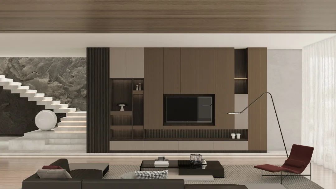 其柜体使用流金科技木,以双饰面的生产工艺高度还原了天然木皮品质和效果,同时解决天然木皮的虫洞、节疤和色变等天然缺陷,媲美原木皮家具,从细节到整体展现出高级贵气的空间质感。