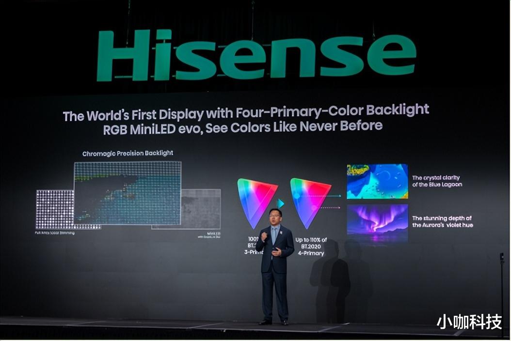 据悉,海信于2025年全球首创并率先量产RGB-Mini LED电视,迅速引领行业掀起“RGB热潮”。此次全新一代技术聚焦三大核心进化,打破传统Mini LED和OLED的色彩、能耗及视觉舒适局限。其中,全球首创的玲珑4芯真彩背光成为最大亮点——海信升级RGB三原色发光芯片,创新性引入第四种天青色自发光芯片,将色域突破至110% BT.2020,使传统三角形色域首次拓展为四边形,较当前最高配置的QD-Mini LED提升10%,较QD-OLED提升18%,色彩体积达行业最高的100%。配合玲珑5面体封装工艺和最佳色彩分离算法,还成功攻克普通彩色背光“串色、色晕、偏色”三大行业难题。