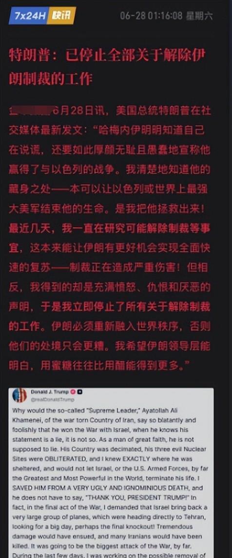果然,特朗普在第二天就在自己是社交账号上发文:“哈梅内伊明明知道自己在说谎,还要如此厚颜无耻愚蠢的宣称他赢得了和以色列的战争,我非常清楚他的位置,本可以让以色列以及美军结束他的生命,但我选择拯救了他”。