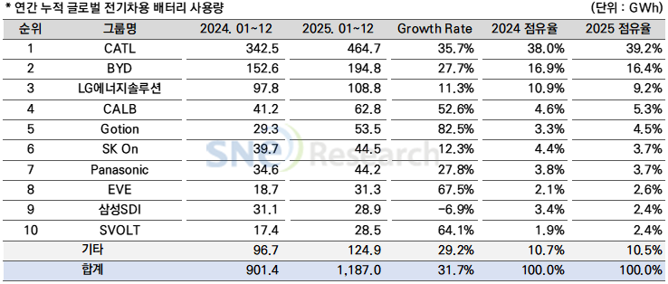 韩国研究机构SNE Research发布最新动力电池统计数据,2025年全球动力电池装车总量达到1,187GWh,同比增长31.7%。中国企业包揽TOP10榜单中的六个席位,合计市场份额高达70.4%,创下有统计以来的最高纪录。具体来看,宁德时代以464.7GWh的装车量连续九年位居全球第一,市场份额高达39.2%;比亚迪紧随其后,装车量为194.8GWh,市占率16.4%;中创新航装车量为62.8GWh,市占率5.3%,排名第四;国轩高科动力电池装车量53.5GWh,同比增长82.5%,增速位居TOP10之首,排名第五;亿纬锂能位列第八,蜂巢能源位列第十。
