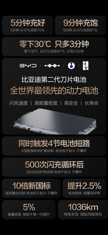 针对“闪充是否会伤害电池、影响寿命”的疑问,比亚迪明确回应:不会。其第二代刀片电池通过构建“锂离子高速通道”和“全温域智能热管理系统”,在提升充电效率的同时,有效控制热量产生并实现均匀散热,最大程度降低闪充对电池寿命的影响。相比第一代,第二代刀片电池寿命更长,性能更优。