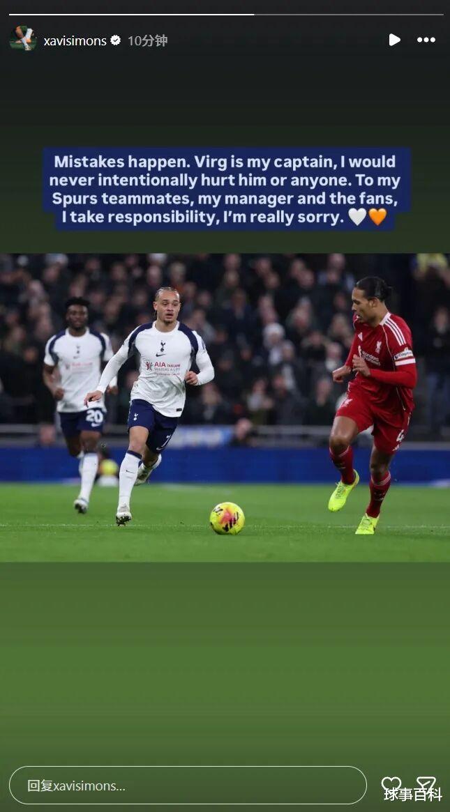 “犯错在所难免,”西哈维-西蒙斯写道。“范戴克是我的队长,我绝不会故意伤害他或任何人。对热刺的队友、教练和球迷们,我承担全部责任,真的很抱歉。”