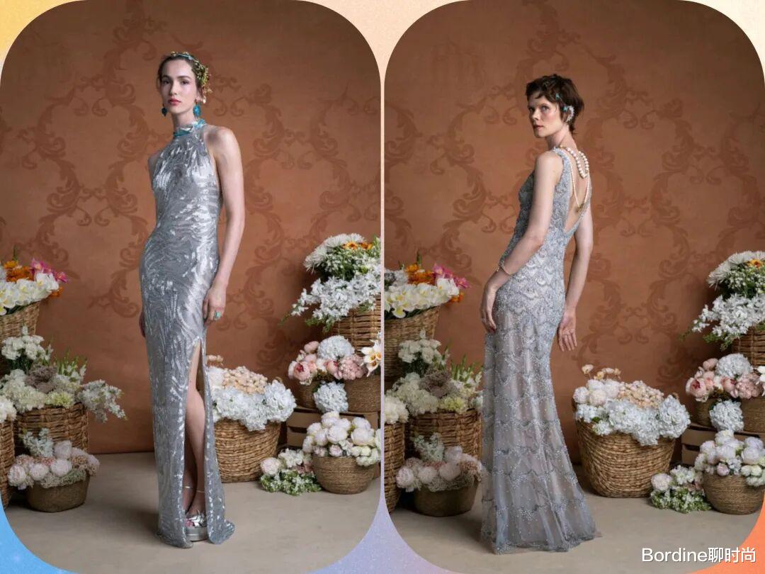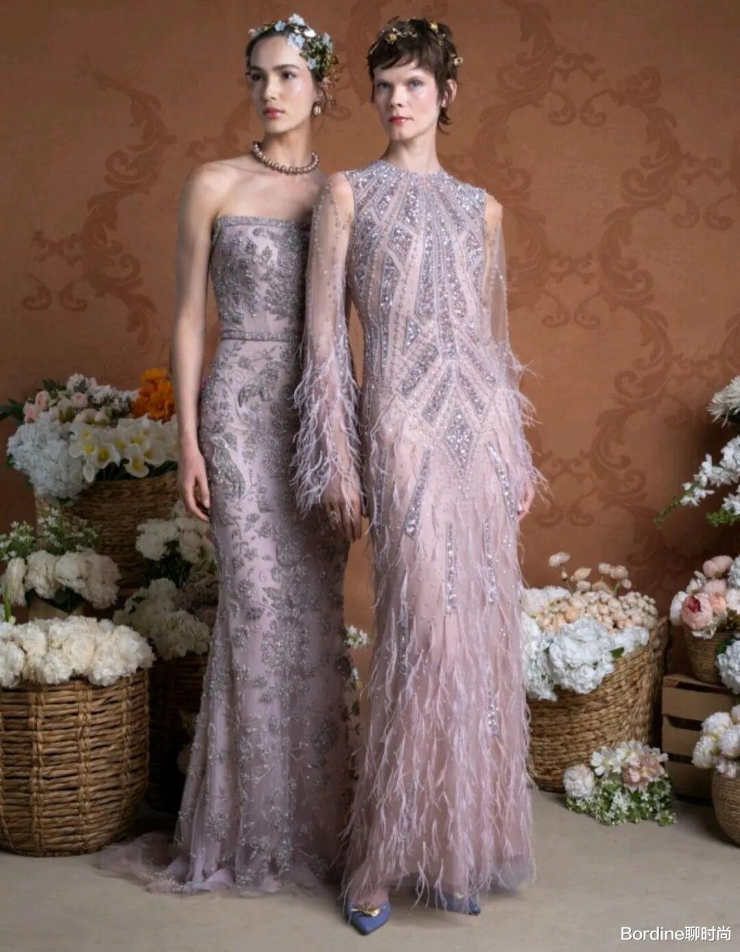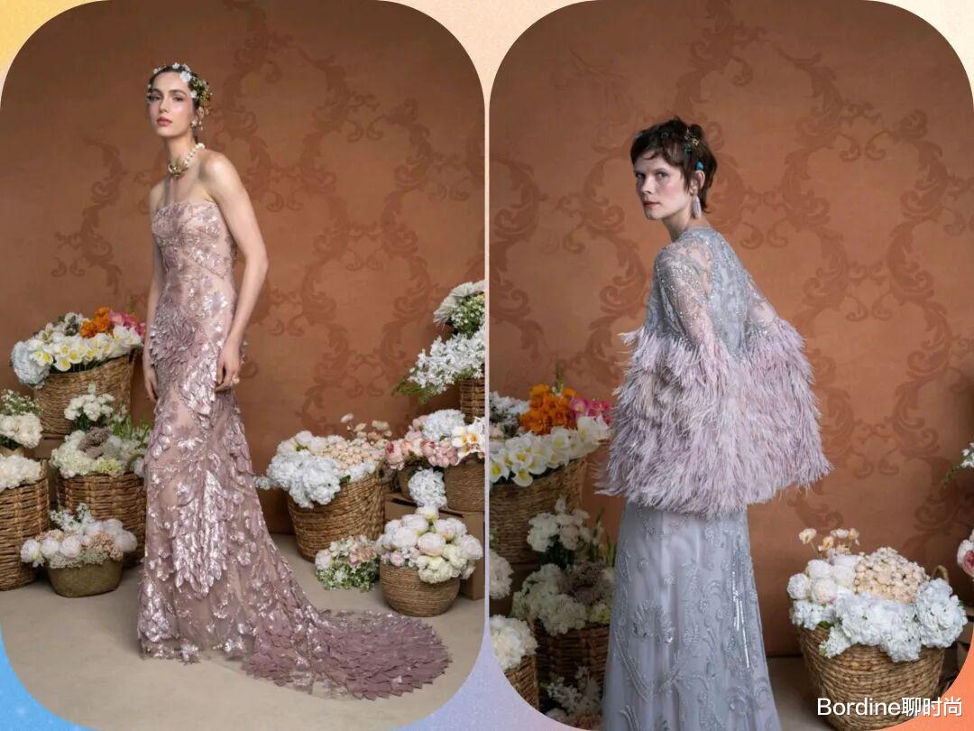 薄纱蕾丝、毛绒流苏等材质的面料有着更多的纹理质感,还在立体的花纹等设计中,也有着更多浪漫甜美的活力气质;在裙摆的位置,拖尾的设计也增加了一些细节的设计潮范儿。