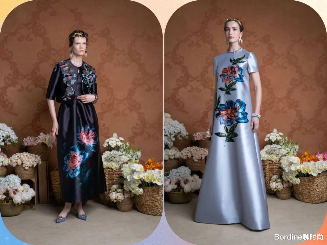 在优雅裙装上服装的廓形增加了更多的线条感,在黑色和银灰色等色彩的低调中,以彩色的粉色、蓝色等颜色的对比搭配,撞色冲击也增加了花卉图案的浪漫细节。